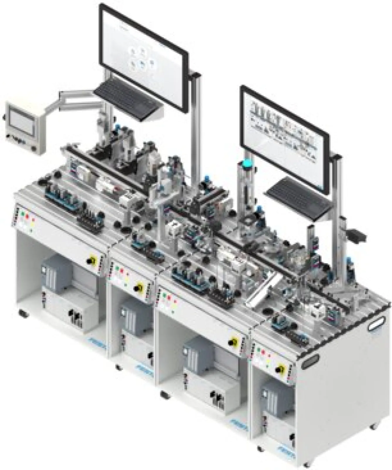 The MPS 404-1 learning factory consists of the MPS 400 system building blocks Distribution Pro, Join, Measure Pro and Sort Inline. The system building blocks are networked with the MES, equipped with RFID read/write devices and intelligent sensors based on IO-Link®, and form a self-sufficient system. In addition to the above-mentioned system building blocks, MPS 404-1 R contains a Robotino and thus expands the learning topics to include the field of mobile robotics and related topics in production.